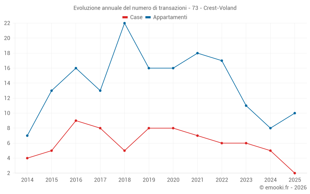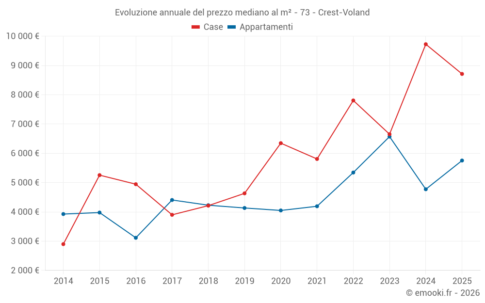 Il prezzo mediano sulle 23 transazioni di appartamenti degli ultimi 24 mesi nel comune di Crest-Voland era di 5 576 € al metro quadrato per un valore patrimoniale mediano di 427 600 €. In questo periodo il 60% delle transazioni era tra 4 727 e 6 839 € al metro quadrato (dal 2° all'8° decile).