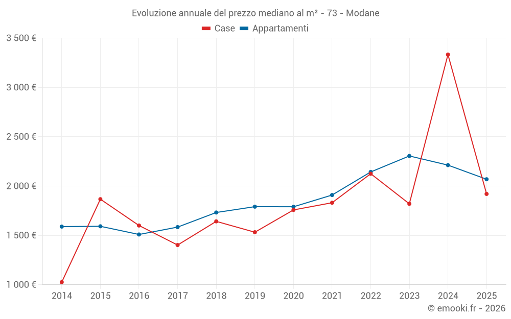Il prezzo mediano sulle 14 transazioni di case degli ultimi 24 mesi nel comune di Modane era di 2 668 € al metro quadrato per un valore patrimoniale mediano di 228 575 €. In questo periodo il 60% delle transazioni era tra 891 e 4 548 € al metro quadrato (dal 2° all'8° decile).
