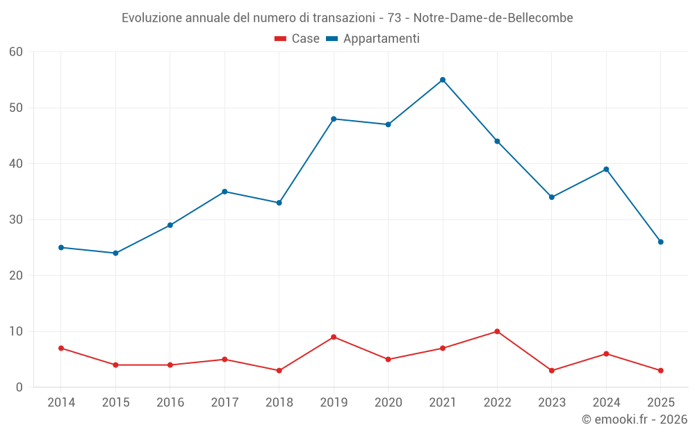 Il prezzo mediano sulle 26 transazioni di appartamenti degli ultimi 6 mesi nel comune di Notre-Dame-de-Bellecombe era di 4 886 € al metro quadrato per un valore patrimoniale mediano di 167 521 €. In questo periodo il 60% delle transazioni era tra 4 286 e 5 763 € al metro quadrato (dal 2° all'8° decile).