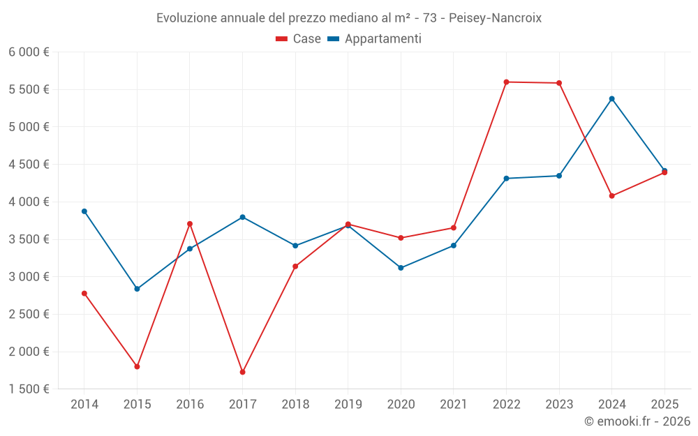 Il prezzo mediano sulle 24 transazioni di appartamenti degli ultimi 12 mesi nel comune di Peisey-Nancroix era di 4 794 € al metro quadrato per un valore patrimoniale mediano di 183 248 €. In questo periodo il 60% delle transazioni era tra 4 124 e 6 088 € al metro quadrato (dal 2° all'8° decile).