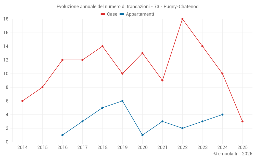 Il prezzo mediano sulle 20 transazioni di case degli ultimi 24 mesi nel comune di Pugny-Chatenod era di 5 056 € al metro quadrato per un valore patrimoniale mediano di 519 600 €. In questo periodo il 60% delle transazioni era tra 3 760 e 6 043 € al metro quadrato (dal 2° all'8° decile).