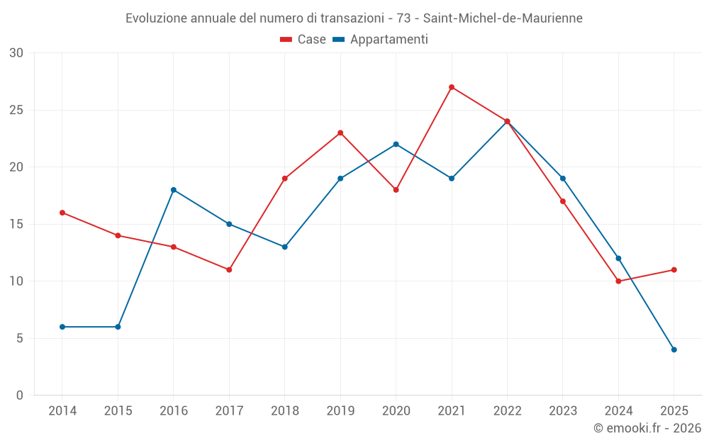 Il prezzo mediano sulle 24 transazioni di appartamenti degli ultimi 24 mesi nel comune di Saint-Michel-de-Maurienne era di 1 386 € al metro quadrato per un valore patrimoniale mediano di 111 375 €. In questo periodo il 60% delle transazioni era tra 837 e 1 767 € al metro quadrato (dal 2° all'8° decile).
