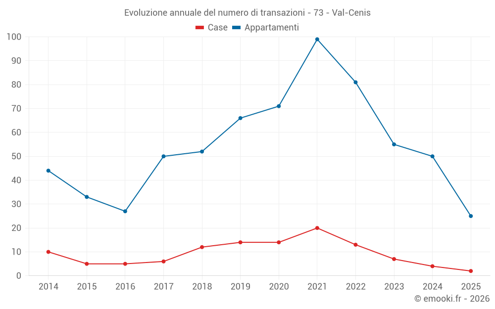 Il prezzo mediano sulle 25 transazioni di appartamenti degli ultimi 6 mesi nel comune di Val-Cenis era di 3 625 € al metro quadrato per un valore patrimoniale mediano di 121 000 €. In questo periodo il 60% delle transazioni era tra 2 352 e 4 522 € al metro quadrato (dal 2° all'8° decile).
