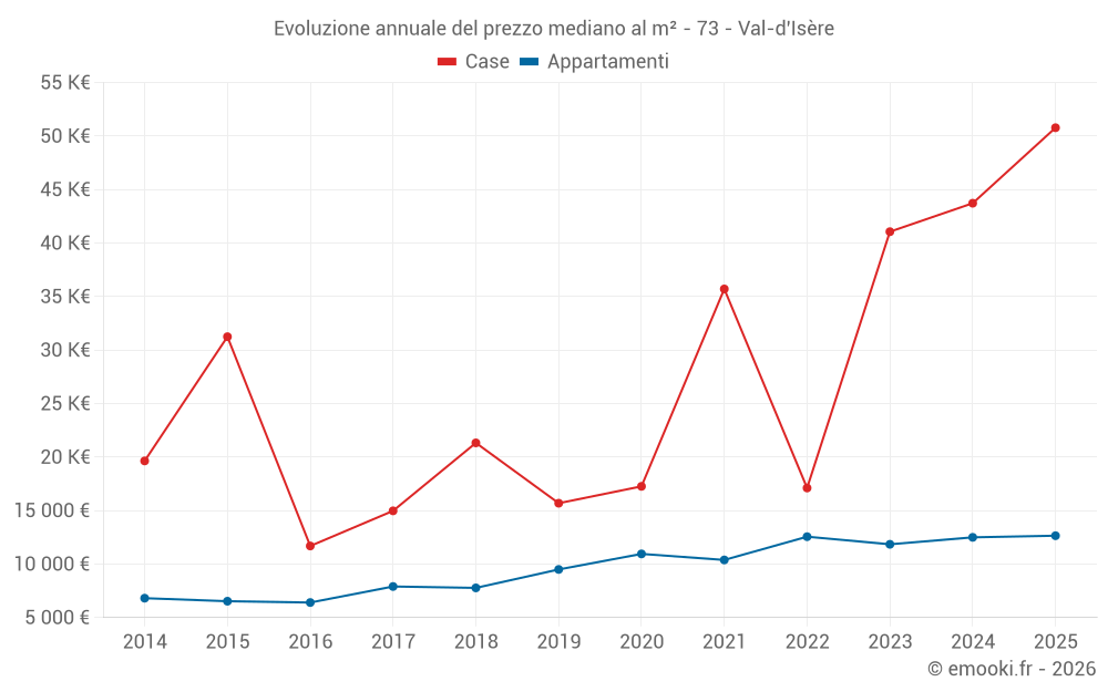 Il prezzo mediano sulle 32 transazioni di appartamenti degli ultimi 3 mesi nel comune di Val-d'Isère era di 12 414 € al metro quadrato per un valore patrimoniale mediano di 388 314 €. In questo periodo il 60% delle transazioni era tra 11 397 e 16 696 € al metro quadrato (dal 2° all'8° decile).