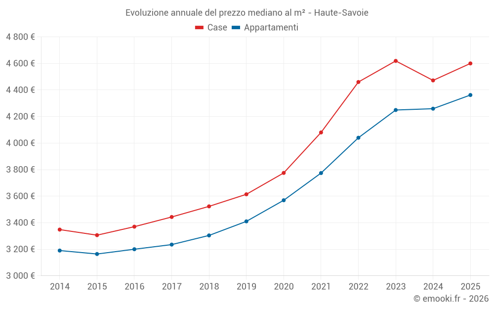 Il prezzo mediano sulle 411 transazioni di case degli ultimi 3 mesi nel dipartimento di Haute-Savoie era di 4 628 € al metro quadrato per un valore patrimoniale mediano di 476 600 €. In questo periodo il 60% delle transazioni era tra 2 963 e 6 563 € al metro quadrato (dal 2° all'8° decile).