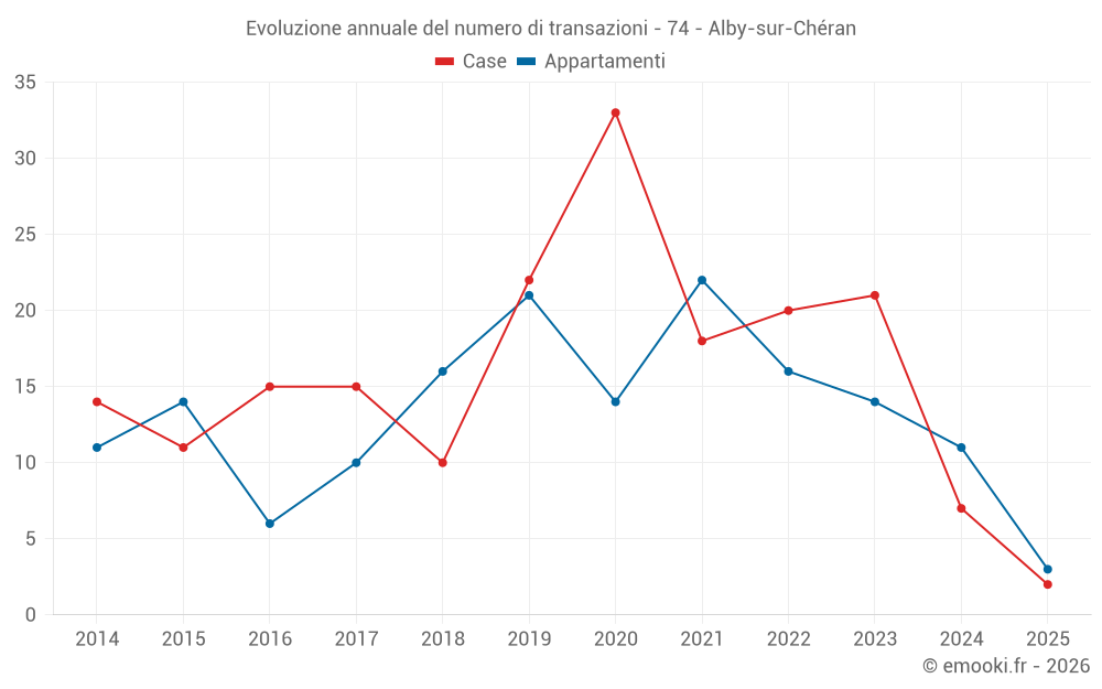 Il prezzo mediano sulle 23 transazioni di appartamenti degli ultimi 24 mesi nel comune di Alby-sur-Chéran era di 4 147 € al metro quadrato per un valore patrimoniale mediano di 244 700 €. In questo periodo il 60% delle transazioni era tra 3 490 e 4 533 € al metro quadrato (dal 2° all'8° decile).