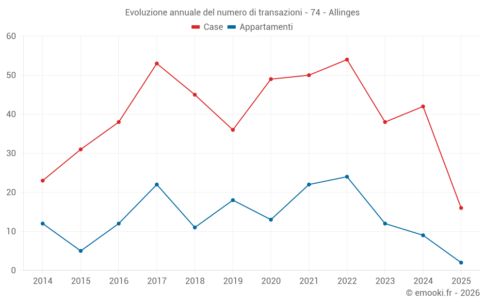 Il prezzo mediano sulle 40 transazioni di case degli ultimi 12 mesi nel comune di Allinges era di 4 208 € al metro quadrato per un valore patrimoniale mediano di 444 762 €. In questo periodo il 60% delle transazioni era tra 2 946 e 4 899 € al metro quadrato (dal 2° all'8° decile).