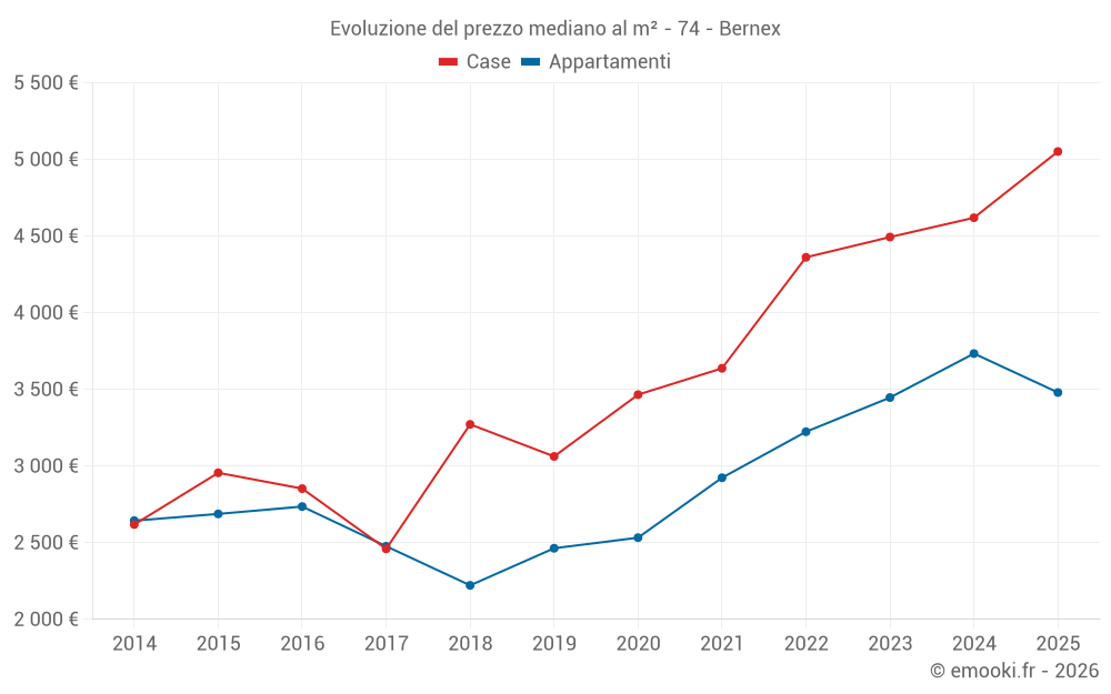 Il prezzo mediano sulle 31 transazioni di case degli ultimi 24 mesi nel comune di Bernex era di 4 608 € al metro quadrato per un valore patrimoniale mediano di 430 000 €. In questo periodo il 60% delle transazioni era tra 3 487 e 5 429 € al metro quadrato (dal 2° all'8° decile).