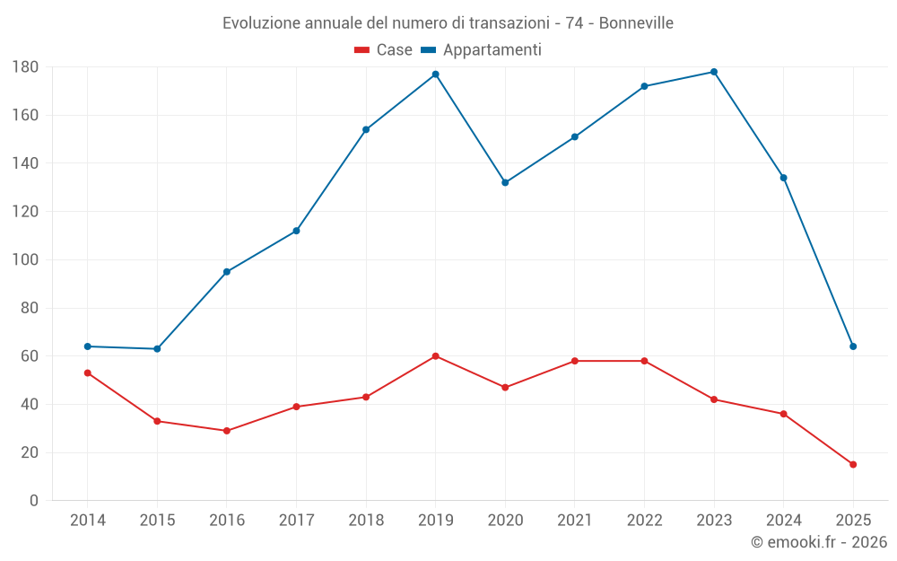 Il prezzo mediano sulle 39 transazioni di case degli ultimi 12 mesi nel comune di Bonneville era di 3 490 € al metro quadrato per un valore patrimoniale mediano di 350 000 €. In questo periodo il 60% delle transazioni era tra 2 601 e 4 282 € al metro quadrato (dal 2° all'8° decile).