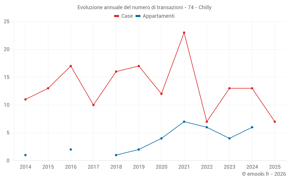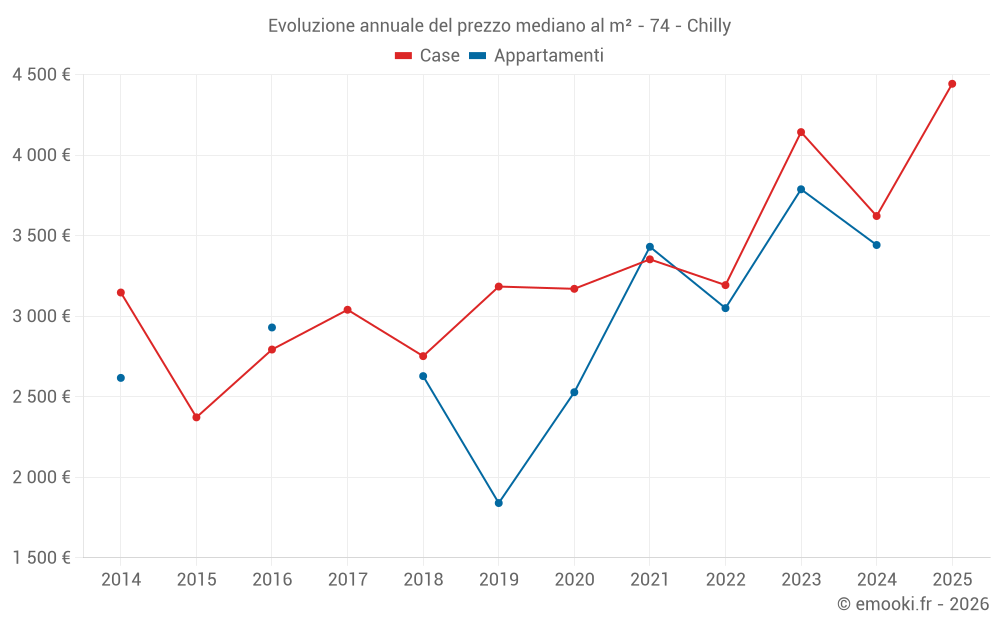 Il prezzo mediano sulle 29 transazioni di case degli ultimi 24 mesi nel comune di Chilly era di 3 985 € al metro quadrato per un valore patrimoniale mediano di 430 600 €. In questo periodo il 60% delle transazioni era tra 3 095 e 5 008 € al metro quadrato (dal 2° all'8° decile).