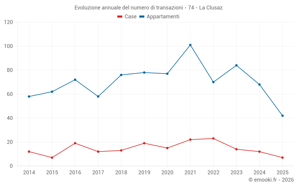 Il prezzo mediano sulle 42 transazioni di appartamenti degli ultimi 6 mesi nel comune di La Clusaz era di 8 394 € al metro quadrato per un valore patrimoniale mediano di 335 665 €. In questo periodo il 60% delle transazioni era tra 6 367 e 10 181 € al metro quadrato (dal 2° all'8° decile).