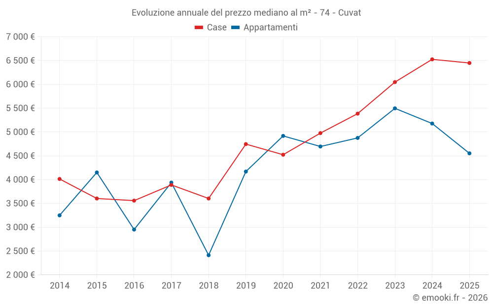 Il prezzo mediano sulle 15 transazioni di case degli ultimi 24 mesi nel comune di Cuvat era di 6 526 € al metro quadrato per un valore patrimoniale mediano di 780 310 €. In questo periodo il 60% delle transazioni era tra 5 320 e 8 325 € al metro quadrato (dal 2° all'8° decile).