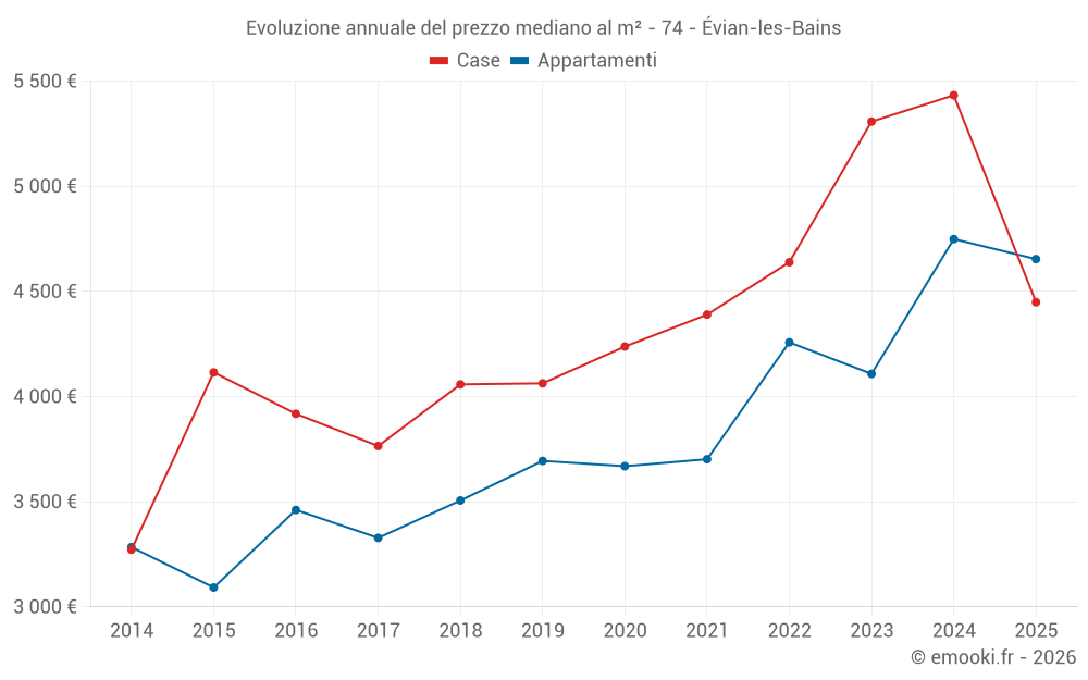 Il prezzo mediano sulle 26 transazioni di case degli ultimi 12 mesi nel comune di Évian-les-Bains era di 5 150 € al metro quadrato per un valore patrimoniale mediano di 552 000 €. In questo periodo il 60% delle transazioni era tra 3 611 e 6 117 € al metro quadrato (dal 2° all'8° decile).