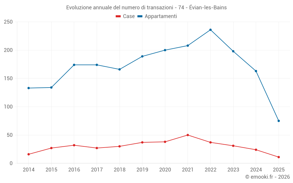 Il prezzo mediano sulle 21 transazioni di appartamenti degli ultimi 3 mesi nel comune di Évian-les-Bains era di 4 912 € al metro quadrato per un valore patrimoniale mediano di 234 330 €. In questo periodo il 60% delle transazioni era tra 3 625 e 5 437 € al metro quadrato (dal 2° all'8° decile).
