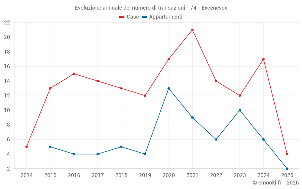 Il prezzo mediano sulle 27 transazioni di case degli ultimi 24 mesi nel comune di Excenevex era di 4 900 € al metro quadrato per un valore patrimoniale mediano di 420 000 €. In questo periodo il 60% delle transazioni era tra 3 162 e 5 698 € al metro quadrato (dal 2° all'8° decile).
