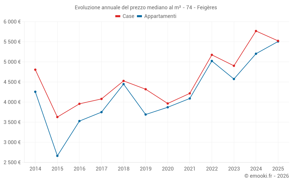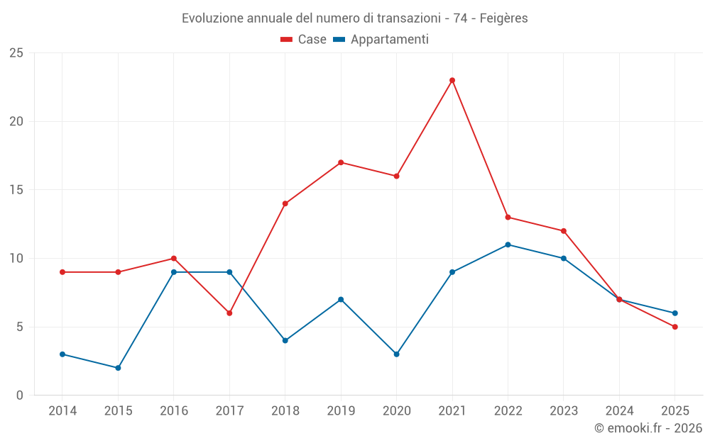 Il prezzo mediano sulle 19 transazioni di appartamenti degli ultimi 24 mesi nel comune di Feigères era di 5 216 € al metro quadrato per un valore patrimoniale mediano di 383 900 €. In questo periodo il 60% delle transazioni era tra 4 779 e 5 620 € al metro quadrato (dal 2° all'8° decile).