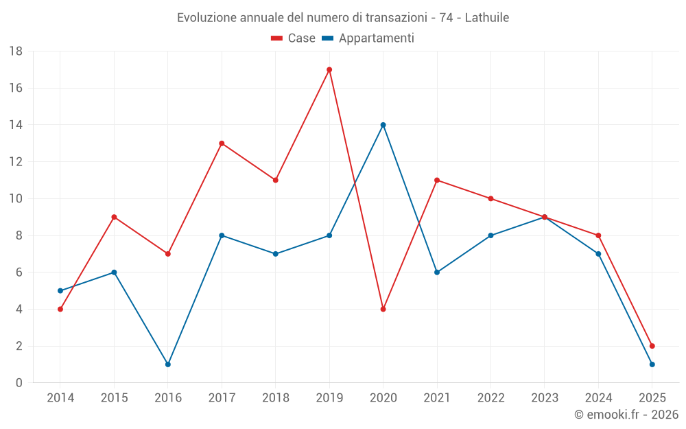 Il prezzo mediano sulle 17 transazioni di case degli ultimi 24 mesi nel comune di Lathuile era di 5 187 € al metro quadrato per un valore patrimoniale mediano di 553 442 €. In questo periodo il 60% delle transazioni era tra 3 269 e 6 303 € al metro quadrato (dal 2° all'8° decile).