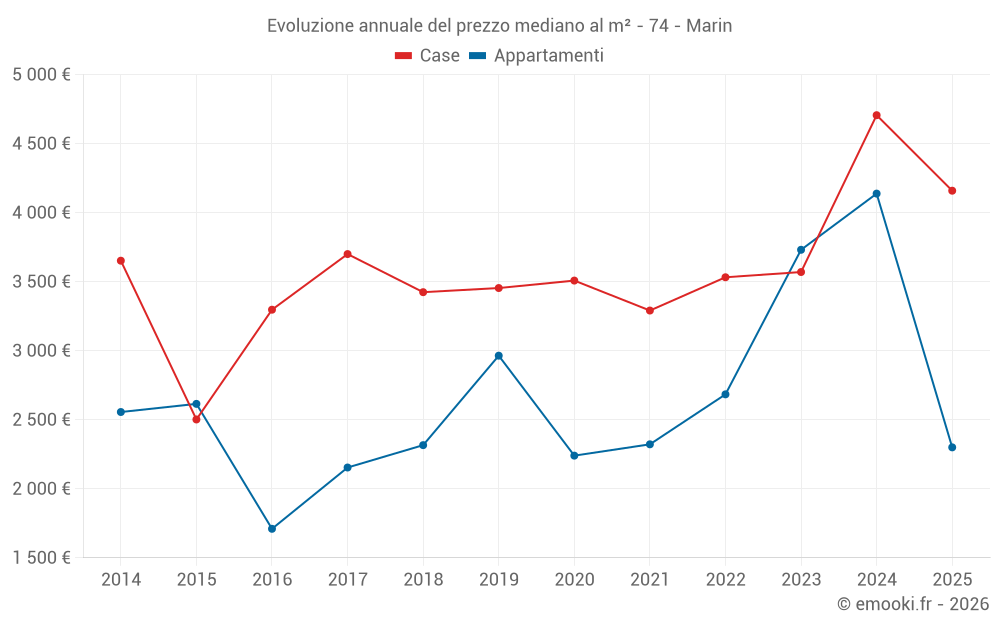 Il prezzo mediano sulle 18 transazioni di case degli ultimi 24 mesi nel comune di Marin era di 4 216 € al metro quadrato per un valore patrimoniale mediano di 428 678 €. In questo periodo il 60% delle transazioni era tra 2 872 e 5 613 € al metro quadrato (dal 2° all'8° decile).