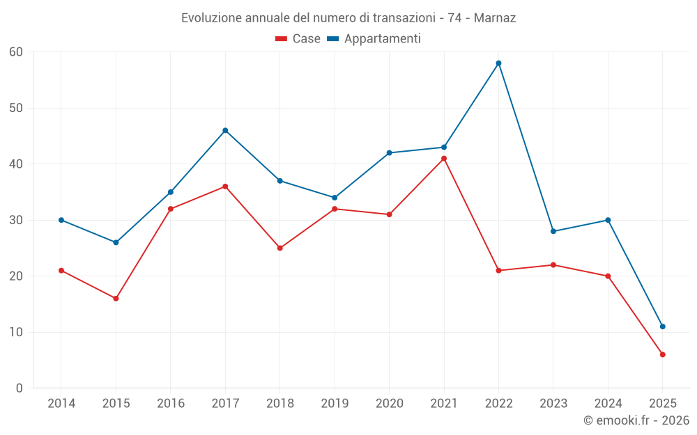 Il prezzo mediano sulle 32 transazioni di appartamenti degli ultimi 12 mesi nel comune di Marnaz era di 2 712 € al metro quadrato per un valore patrimoniale mediano di 212 400 €. In questo periodo il 60% delle transazioni era tra 2 048 e 3 296 € al metro quadrato (dal 2° all'8° decile).