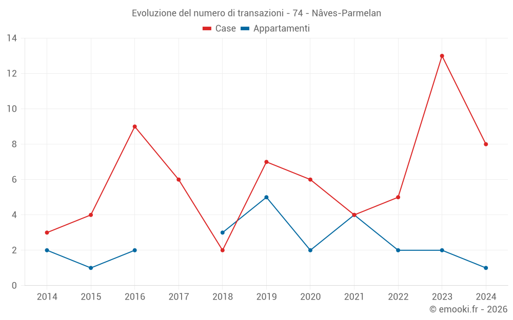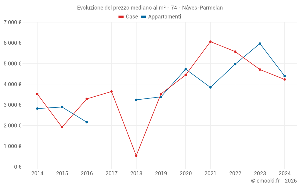 Il prezzo mediano sulle 15 transazioni di case degli ultimi 24 mesi nel comune di Nâves-Parmelan era di 4 504 € al metro quadrato per un valore patrimoniale mediano di 548 600 €. In questo periodo il 60% delle transazioni era tra 3 591 e 5 140 € al metro quadrato (dal 2° all'8° decile).