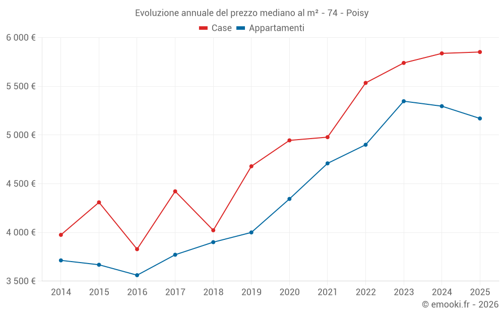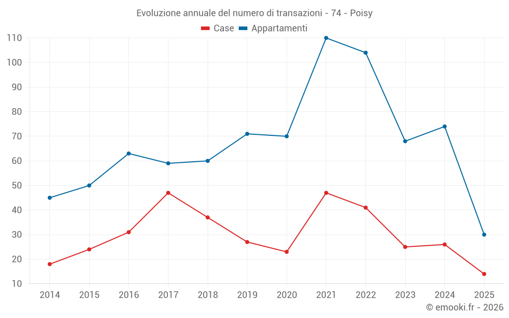 Il prezzo mediano sulle 30 transazioni di appartamenti degli ultimi 6 mesi nel comune di Poisy era di 5 170 € al metro quadrato per un valore patrimoniale mediano di 322 500 €. In questo periodo il 60% delle transazioni era tra 3 510 e 5 978 € al metro quadrato (dal 2° all'8° decile).