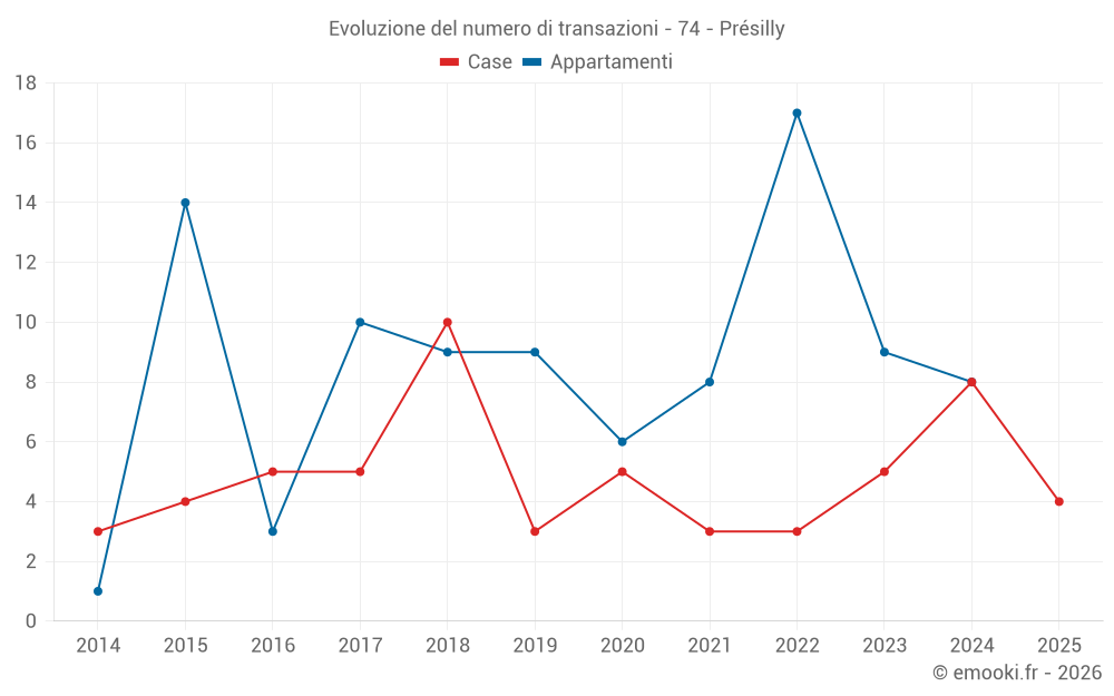 Il prezzo mediano sulle 15 transazioni di appartamenti degli ultimi 24 mesi nel comune di Présilly era di 4 887 € al metro quadrato per un valore patrimoniale mediano di 478 000 €. In questo periodo il 60% delle transazioni era tra 4 636 e 5 436 € al metro quadrato (dal 2° all'8° decile).