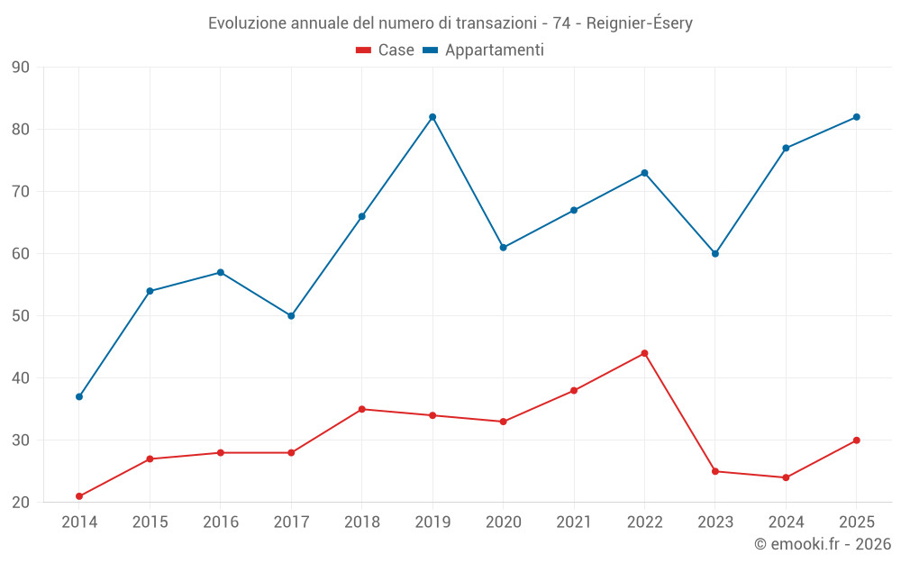Il prezzo mediano sulle 47 transazioni di appartamenti degli ultimi 6 mesi nel comune di Reignier-Ésery era di 4 253 € al metro quadrato per un valore patrimoniale mediano di 289 650 €. In questo periodo il 60% delle transazioni era tra 3 485 e 4 676 € al metro quadrato (dal 2° all'8° decile).