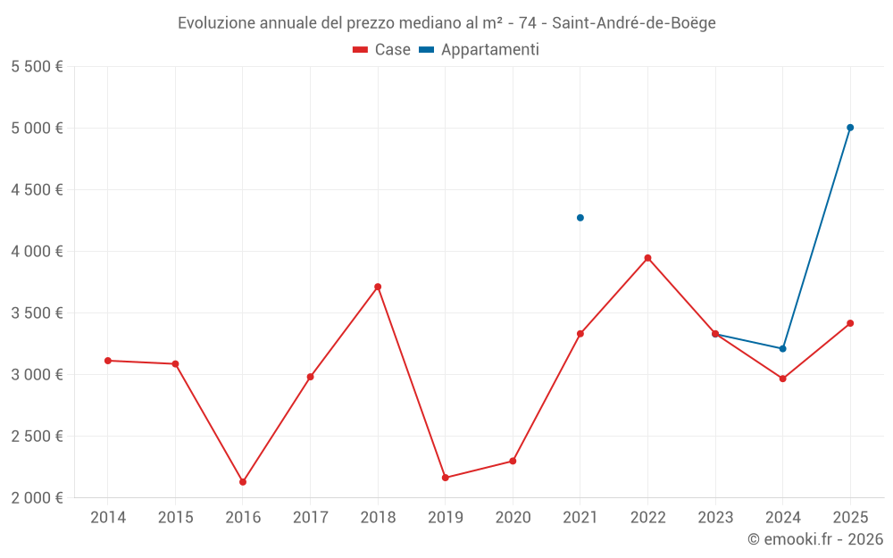 Il prezzo mediano sulle 15 transazioni di case degli ultimi 24 mesi nel comune di Saint-André-de-Boëge era di 3 042 € al metro quadrato per un valore patrimoniale mediano di 230 000 €. In questo periodo il 60% delle transazioni era tra 1 440 e 4 500 € al metro quadrato (dal 2° all'8° decile).