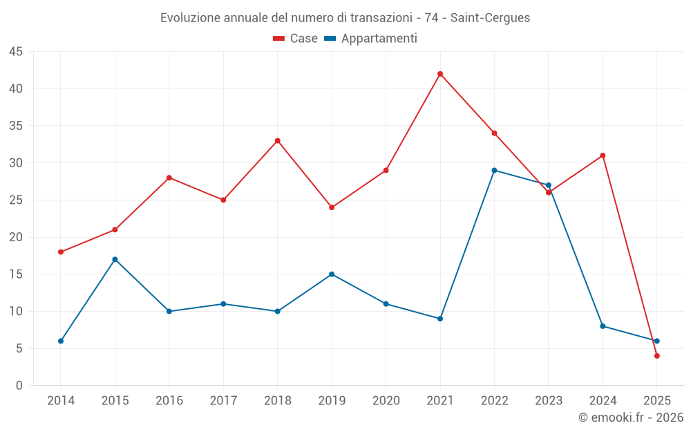 Il prezzo mediano sulle 28 transazioni di appartamenti degli ultimi 24 mesi nel comune di Saint-Cergues era di 4 290 € al metro quadrato per un valore patrimoniale mediano di 250 500 €. In questo periodo il 60% delle transazioni era tra 3 469 e 4 816 € al metro quadrato (dal 2° all'8° decile).