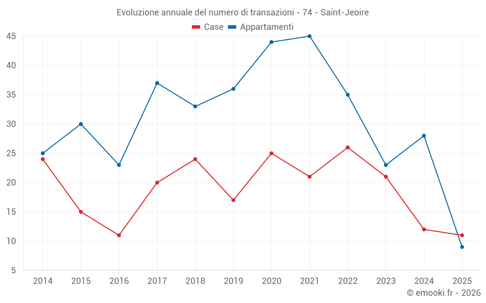 Il prezzo mediano sulle 20 transazioni di appartamenti degli ultimi 12 mesi nel comune di Saint-Jeoire era di 2 986 € al metro quadrato per un valore patrimoniale mediano di 84 050 €. In questo periodo il 60% delle transazioni era tra 2 550 e 3 542 € al metro quadrato (dal 2° all'8° decile).