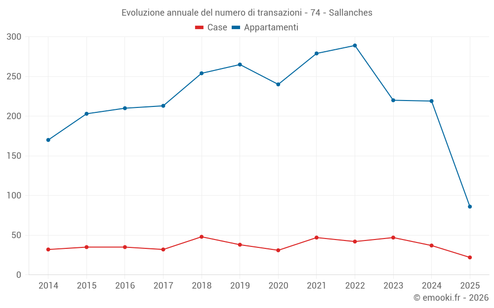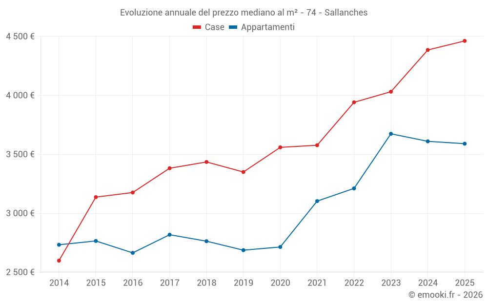 Il prezzo mediano sulle 22 transazioni di case degli ultimi 6 mesi nel comune di Sallanches era di 4 462 € al metro quadrato per un valore patrimoniale mediano di 456 000 €. In questo periodo il 60% delle transazioni era tra 3 721 e 4 962 € al metro quadrato (dal 2° all'8° decile).