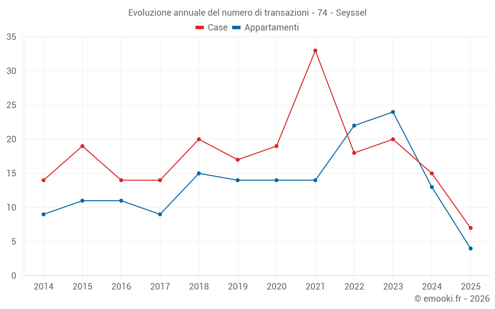 Il prezzo mediano sulle 31 transazioni di appartamenti degli ultimi 24 mesi nel comune di Seyssel era di 2 719 € al metro quadrato per un valore patrimoniale mediano di 155 000 €. In questo periodo il 60% delle transazioni era tra 2 262 e 3 372 € al metro quadrato (dal 2° all'8° decile).