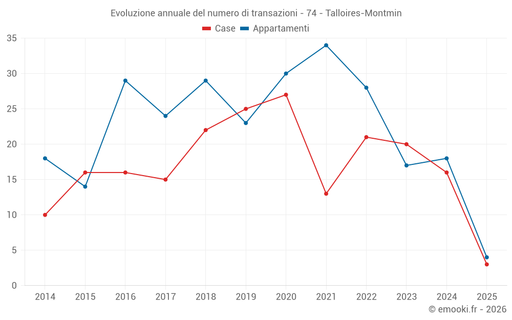 Il prezzo mediano sulle 30 transazioni di appartamenti degli ultimi 24 mesi nel comune di Talloires-Montmin era di 6 250 € al metro quadrato per un valore patrimoniale mediano di 332 398 €. In questo periodo il 60% delle transazioni era tra 3 826 e 7 715 € al metro quadrato (dal 2° all'8° decile).