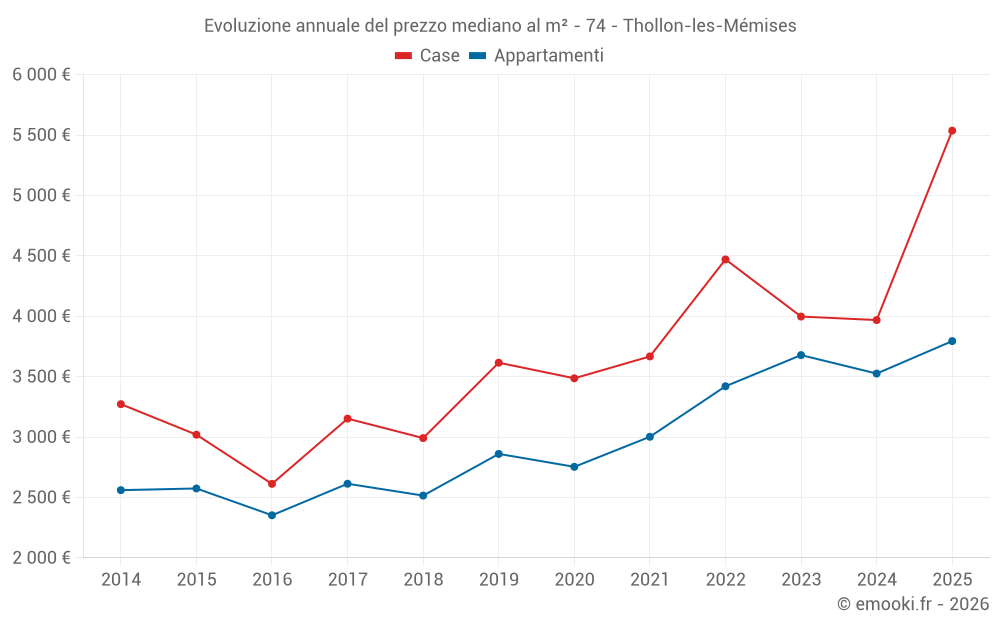 Il prezzo mediano sulle 21 transazioni di case degli ultimi 24 mesi nel comune di Thollon-les-Mémises era di 4 433 € al metro quadrato per un valore patrimoniale mediano di 351 000 €. In questo periodo il 60% delle transazioni era tra 3 059 e 5 702 € al metro quadrato (dal 2° all'8° decile).