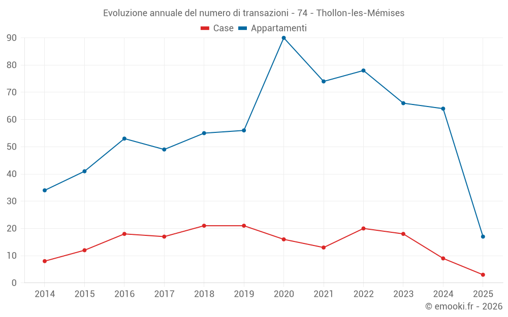 Il prezzo mediano sulle 47 transazioni di appartamenti degli ultimi 12 mesi nel comune di Thollon-les-Mémises era di 3 502 € al metro quadrato per un valore patrimoniale mediano di 107 000 €. In questo periodo il 60% delle transazioni era tra 3 088 e 4 125 € al metro quadrato (dal 2° all'8° decile).