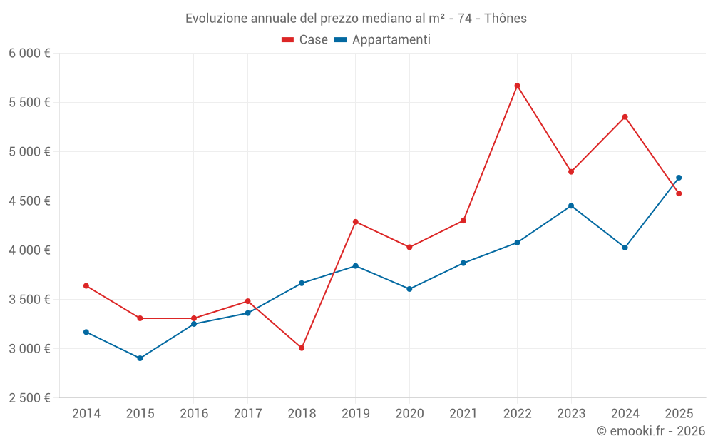 Il prezzo mediano sulle 18 transazioni di case degli ultimi 12 mesi nel comune di Thônes era di 4 910 € al metro quadrato per un valore patrimoniale mediano di 443 300 €. In questo periodo il 60% delle transazioni era tra 3 770 e 7 743 € al metro quadrato (dal 2° all'8° decile).