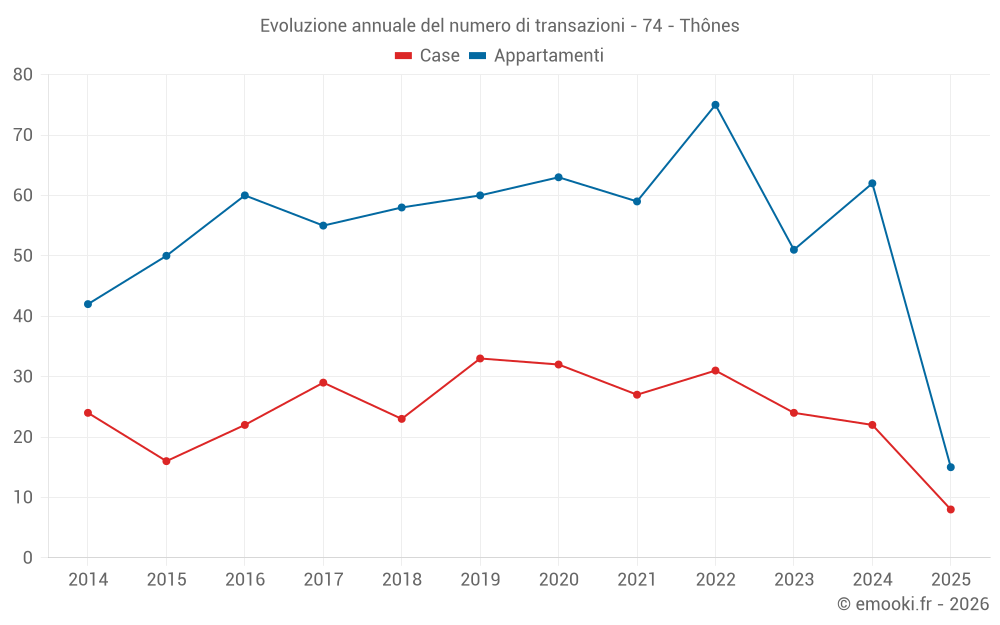 Il prezzo mediano sulle 48 transazioni di appartamenti degli ultimi 12 mesi nel comune di Thônes era di 4 590 € al metro quadrato per un valore patrimoniale mediano di 233 925 €. In questo periodo il 60% delle transazioni era tra 3 393 e 5 113 € al metro quadrato (dal 2° all'8° decile).