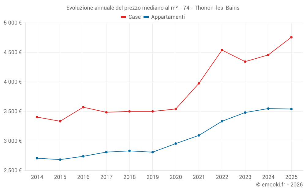 Il prezzo mediano sulle 22 transazioni di case degli ultimi 6 mesi nel comune di Thonon-les-Bains era di 4 756 € al metro quadrato per un valore patrimoniale mediano di 488 375 €. In questo periodo il 60% delle transazioni era tra 3 724 e 5 316 € al metro quadrato (dal 2° all'8° decile).