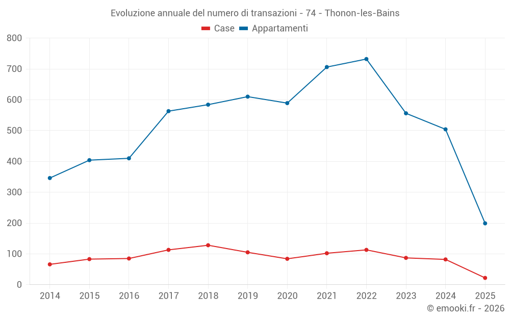 Il prezzo mediano sulle 59 transazioni di appartamenti degli ultimi 3 mesi nel comune di Thonon-les-Bains era di 3 582 € al metro quadrato per un valore patrimoniale mediano di 193 000 €. In questo periodo il 60% delle transazioni era tra 2 737 e 4 360 € al metro quadrato (dal 2° all'8° decile).