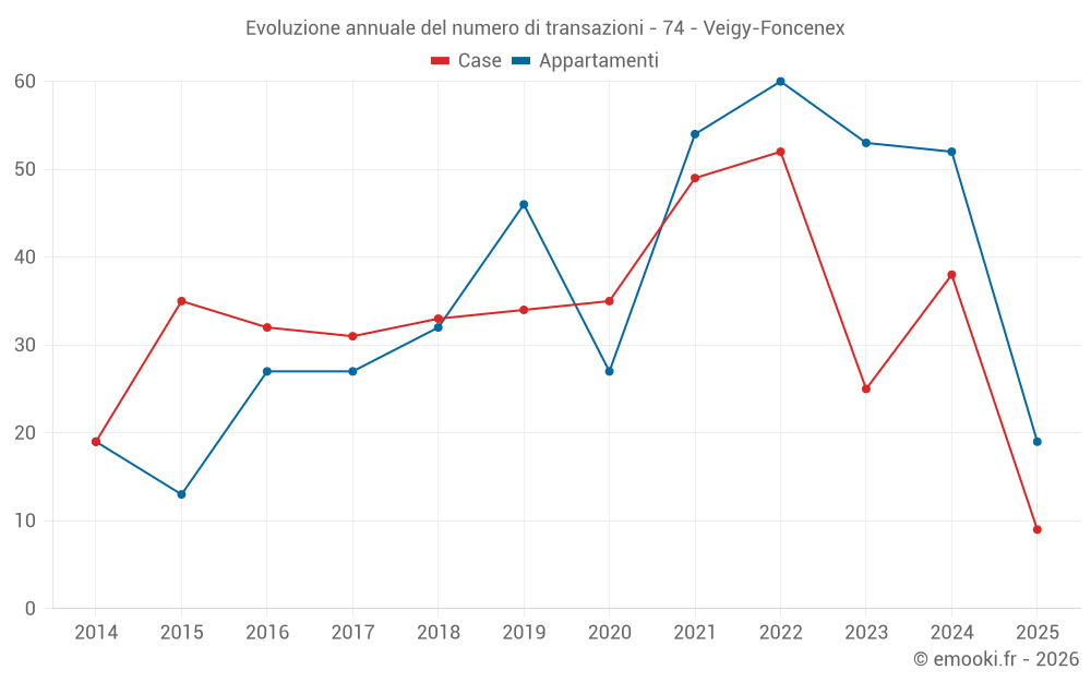 Il prezzo mediano sulle 32 transazioni di case degli ultimi 12 mesi nel comune di Veigy-Foncenex era di 4 632 € al metro quadrato per un valore patrimoniale mediano di 622 365 €. In questo periodo il 60% delle transazioni era tra 3 453 e 6 194 € al metro quadrato (dal 2° all'8° decile).