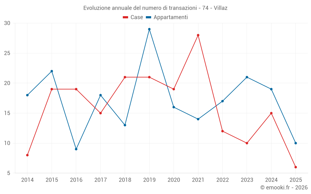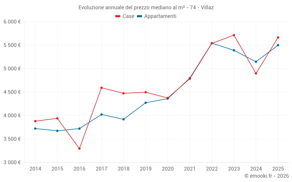 Il prezzo mediano sulle 16 transazioni di appartamenti degli ultimi 12 mesi nel comune di Villaz era di 5 263 € al metro quadrato per un valore patrimoniale mediano di 328 425 €. In questo periodo il 60% delle transazioni era tra 4 957 e 5 636 € al metro quadrato (dal 2° all'8° decile).