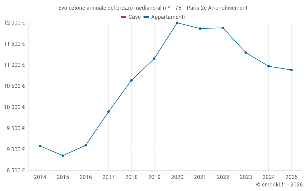 Il prezzo mediano sulle 58 transazioni di appartamenti degli ultimi 3 mesi nel comune di Paris 2e Arrondissement era di 11 111 € al metro quadrato per un valore patrimoniale mediano di 335 110 €. In questo periodo il 60% delle transazioni era tra 9 345 e 13 457 € al metro quadrato (dal 2° all'8° decile).