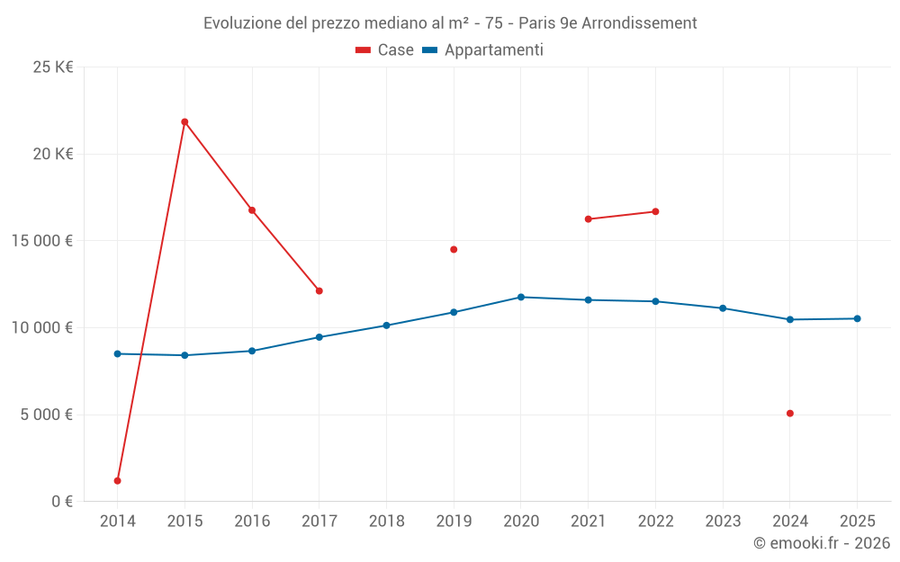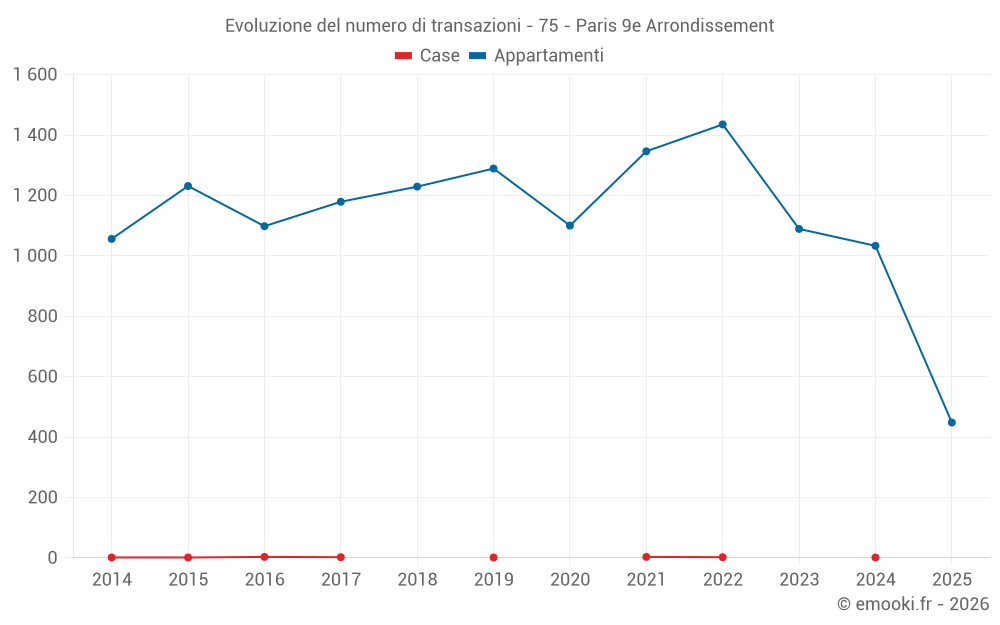Il prezzo mediano sulle 148 transazioni di appartamenti degli ultimi 3 mesi nel comune di Paris 9e Arrondissement era di 10 552 € al metro quadrato per un valore patrimoniale mediano di 350 500 €. In questo periodo il 60% delle transazioni era tra 8 485 e 12 372 € al metro quadrato (dal 2° all'8° decile).