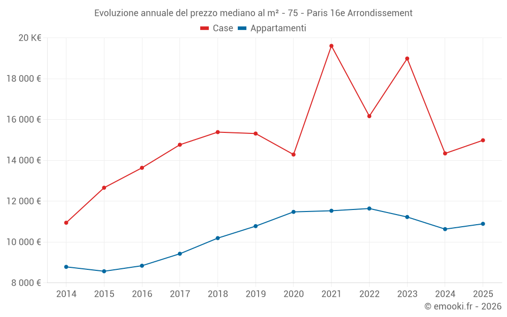 Il prezzo mediano sulle 17 transazioni di case degli ultimi 12 mesi nel comune di Paris 16e Arrondissement era di 15 500 € al metro quadrato per un valore patrimoniale mediano di 2 820 000 €. In questo periodo il 60% delle transazioni era tra 10 877 e 21 905 € al metro quadrato (dal 2° all'8° decile).