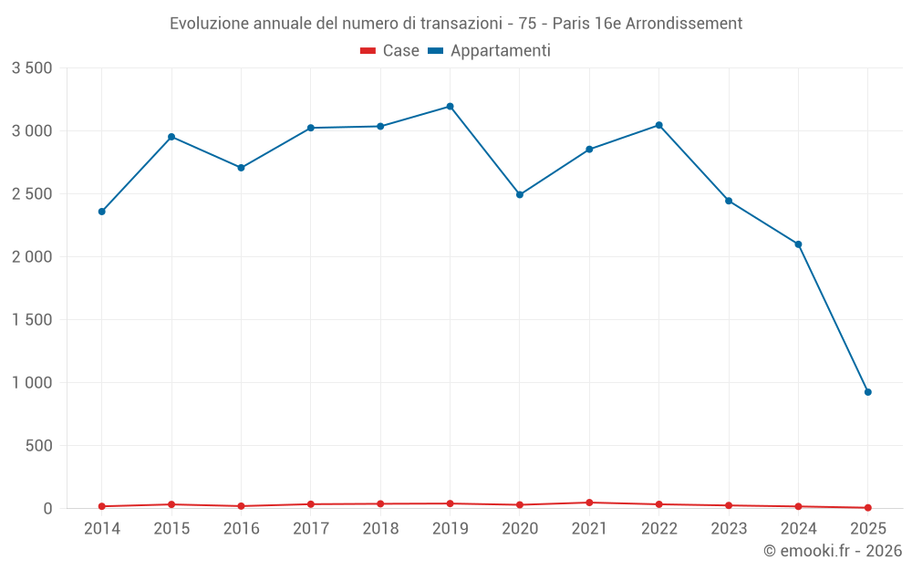 Il prezzo mediano sulle 214 transazioni di appartamenti degli ultimi 3 mesi nel comune di Paris 16e Arrondissement era di 11 074 € al metro quadrato per un valore patrimoniale mediano di 755 000 €. In questo periodo il 60% delle transazioni era tra 8 815 e 13 833 € al metro quadrato (dal 2° all'8° decile).