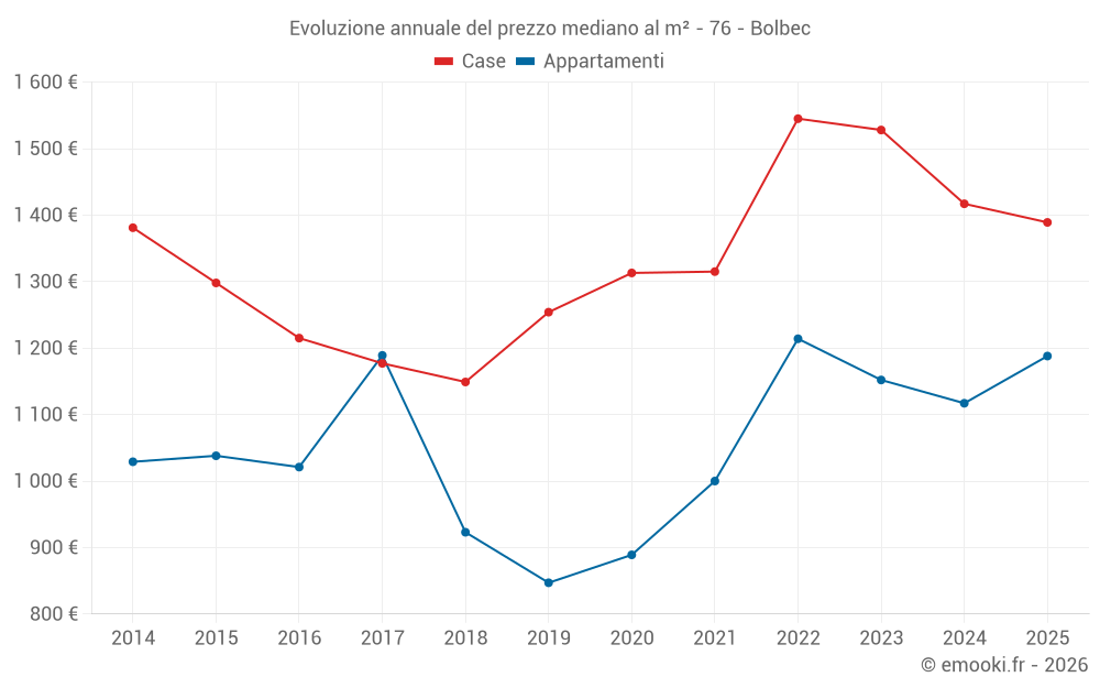 Il prezzo mediano sulle 26 transazioni di case degli ultimi 3 mesi nel comune di Bolbec era di 1 201 € al metro quadrato per un valore patrimoniale mediano di 117 000 €. In questo periodo il 60% delle transazioni era tra 856 e 1 870 € al metro quadrato (dal 2° all'8° decile).