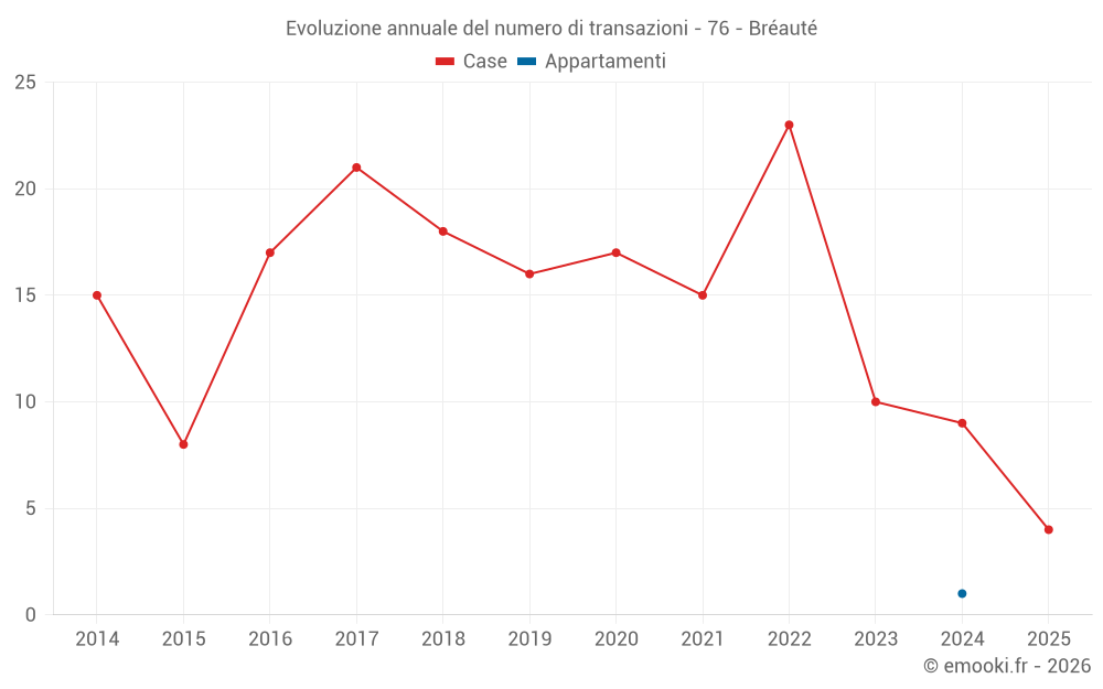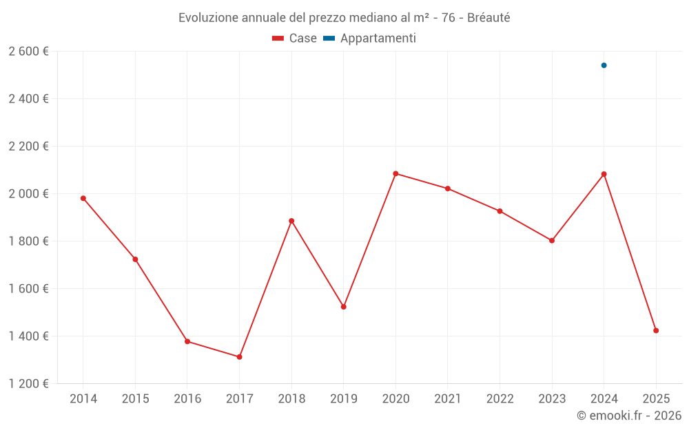 Il prezzo mediano sulle 18 transazioni di case degli ultimi 24 mesi nel comune di Bréauté era di 1 666 € al metro quadrato per un valore patrimoniale mediano di 144 100 €. In questo periodo il 60% delle transazioni era tra 1 345 e 2 410 € al metro quadrato (dal 2° all'8° decile).