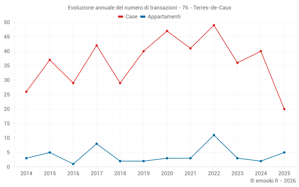 Il prezzo mediano sulle 20 transazioni di case degli ultimi 6 mesi nel comune di Terres-de-Caux era di 1 584 € al metro quadrato per un valore patrimoniale mediano di 158 750 €. In questo periodo il 60% delle transazioni era tra 1 005 e 2 105 € al metro quadrato (dal 2° all'8° decile).