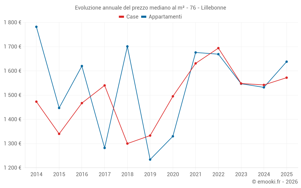 Il prezzo mediano sulle 18 transazioni di appartamenti degli ultimi 12 mesi nel comune di Lillebonne era di 1 544 € al metro quadrato per un valore patrimoniale mediano di 103 500 €. In questo periodo il 60% delle transazioni era tra 1 230 e 1 644 € al metro quadrato (dal 2° all'8° decile).