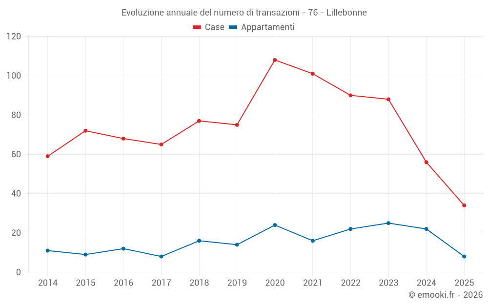 Il prezzo mediano sulle 34 transazioni di case degli ultimi 6 mesi nel comune di Lillebonne era di 1 572 € al metro quadrato per un valore patrimoniale mediano di 120 510 €. In questo periodo il 60% delle transazioni era tra 1 290 e 1 934 € al metro quadrato (dal 2° all'8° decile).